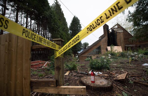 Police tape and an empty fire extinguisher are seen outside a $16-million vacant home that was damaged by fire in the Point Grey neighbourhood of Vancouver, B.C., on Thursday November 10, 2016.DARRYL DYCK/The Globe and Mail