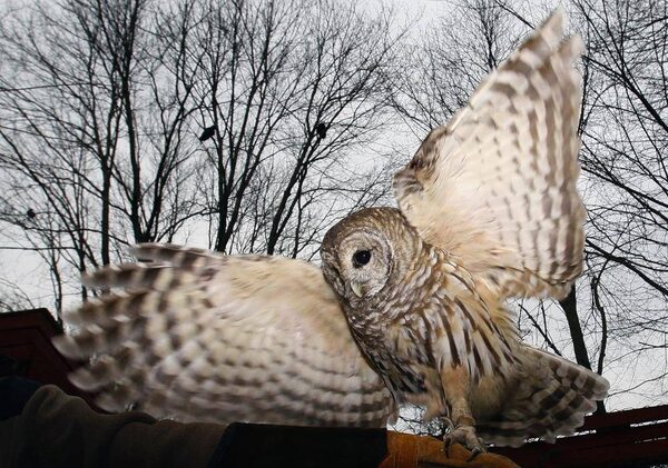 Vilma, an injured Barred Owl, spreads her wings at the Raptor Trust, a bird sanctuary and rehabilitation center about 30 miles west of New York City in Millington, New Jersey December 12, 2006. The Raptor Trust has helped more than 85,000 birds releasing about 60 per cent back into the wild since being founded more than 40-years-ago by ornotholgist Len Soucy who is the director of the center.MIKE SEGAR/Reuters