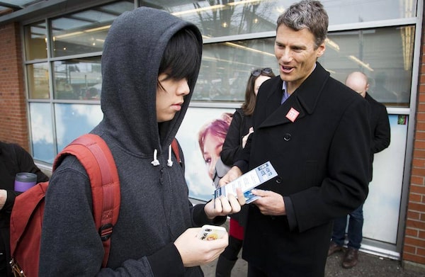 Vancouver Mayor Gregor Robertson speaks to commuters at the Broadway.Ben Nelms/The Globe and Mail