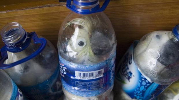 The plastic bottles had their ends removed to insert the birds for travel.
