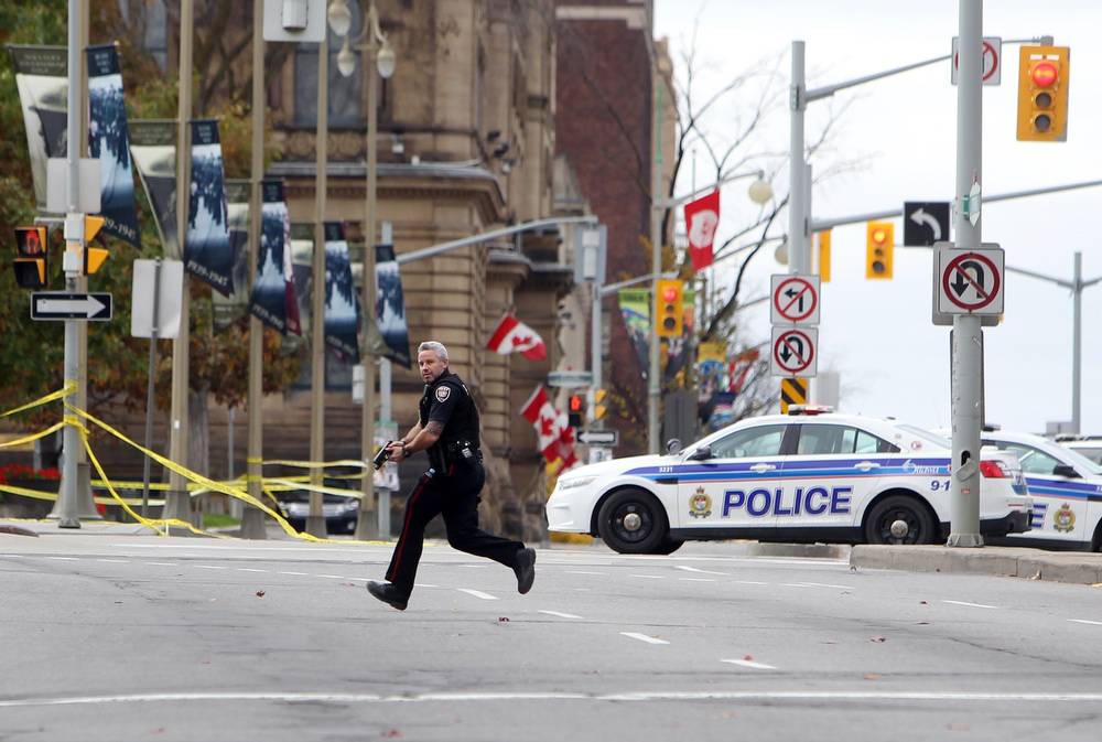 An officer runs across Wellington Street as RCMP and Ottawa Police officers search for a gunman following reports of a shooting on Parliament Hill in Ottawa. This photo by Cole Burston is nominated in the Spot News category.