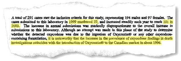 The Office of the Chief Coroner of Ontario raised concerns, noting in a 2004 report that deaths linked to oxycodone climbed steadily between 1999 and 2003, according to documents obtained by The Globe through an access-to-information request. The report says that although no attempt was made to determine whether the detected oxycodone was due to "the ingestion of OxyContin or any other oxycodone-containing formulation, it is noteworthy that the increase in the prevalence of oxycodone findings in death investigations coincides with the introduction of Oxycontin [sic] to the Canadian market."