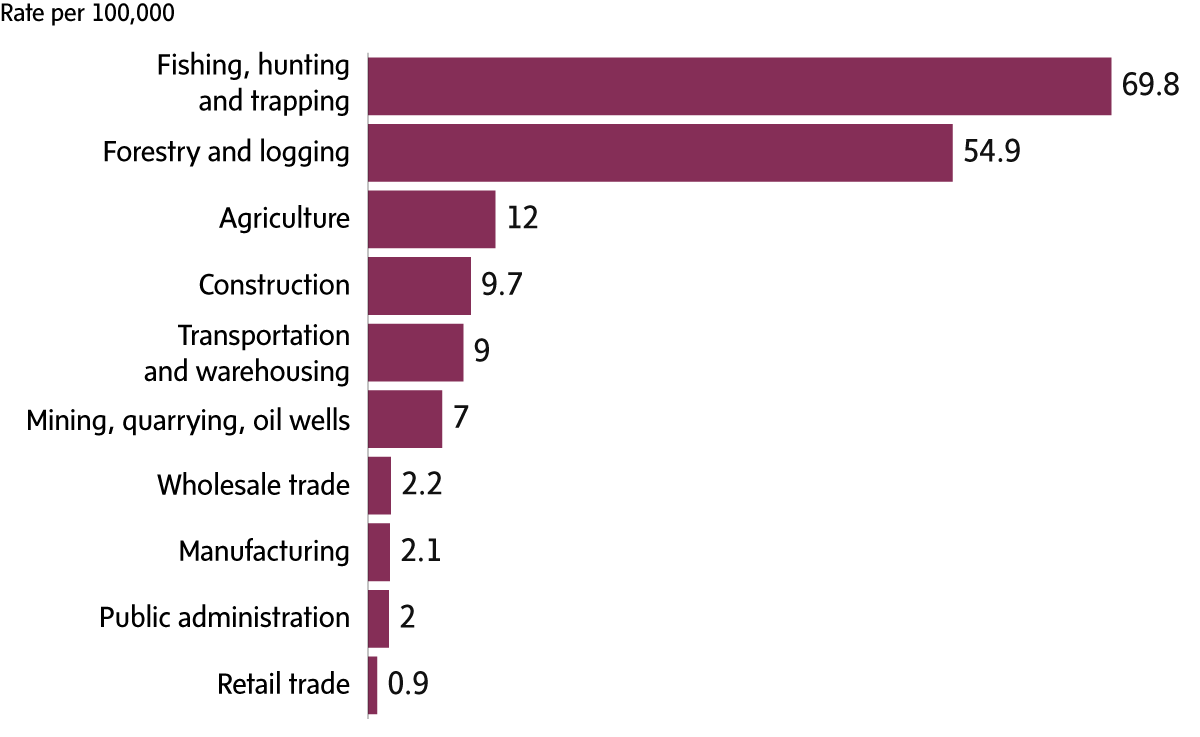 This showed fishing and trapping has the highest fatality rate (fishing constitutes all of the category). Statscan’s 1996 study also found that the fishing and trapping industry was most dangerous.