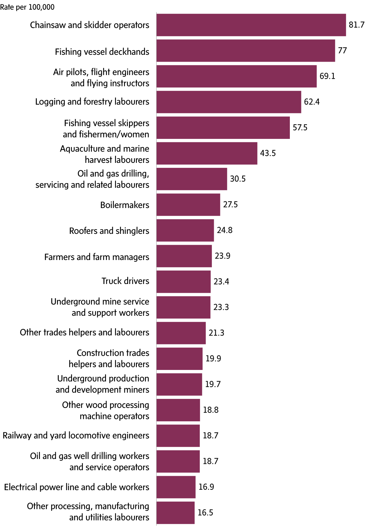 The answer isn’t readily available. While data are produced on the annual number of death claims by occupation, Canada – unlike other developed countries – doesn’t produce worker fatality rates. For example, high numbers of truck drivers die each year. But trucking employs a lot of workers, so is the risk of an on-the-job fatality actually higher? (By fatality rate, it still ranks in the top 12 most risky jobs, we found.)