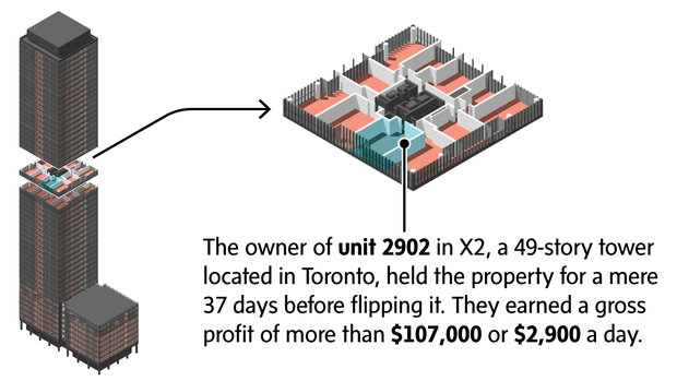 The Globe and Mail examined more than 1,000 transactions in the building, from preconstruction sales to rental offerings, to understand the economics behind condo flipping. The results reveal the potential for lucrative gains – almost $500 a day, on average – and support analysts' concerns that investors and speculators are buying and selling condos just like stocks, driving up prices, crowding out first-time buyers and creating unstable rental housing.