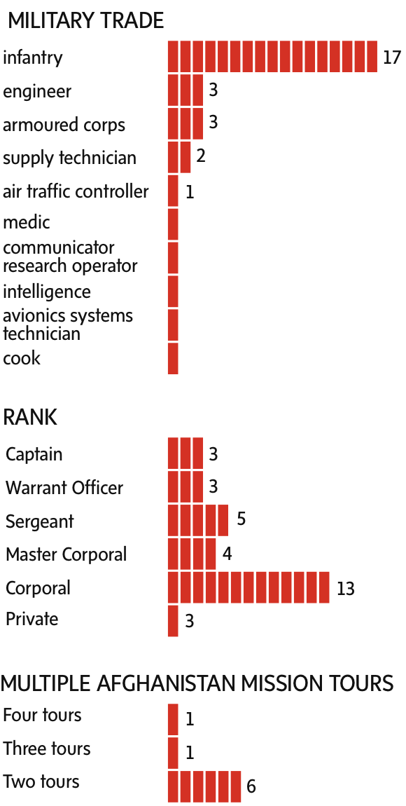 Last Post: The long-time soldier sought help for his mental illness, going to counselling and taking medication. Along with PTSD, he was diagnosed with major depressive disorder. He was released from the military in May, 2013, and moved to Doaktown, N.B., with his new partner and her son. His four children joined them in August. He quit drinking to look after them, but he was struggling financially to care for everyone. Unable to work because of his illnesses, he was reliant on his disability benefits and a pension from Veterans Affairs. Sgt. Anderson was stressed, but no one thought he was suicidal. He shot himself in a shed at his home on Feb. 24, 2014, less than a year after his medical discharge from the military. He had been in the regular force for nearly two decades.