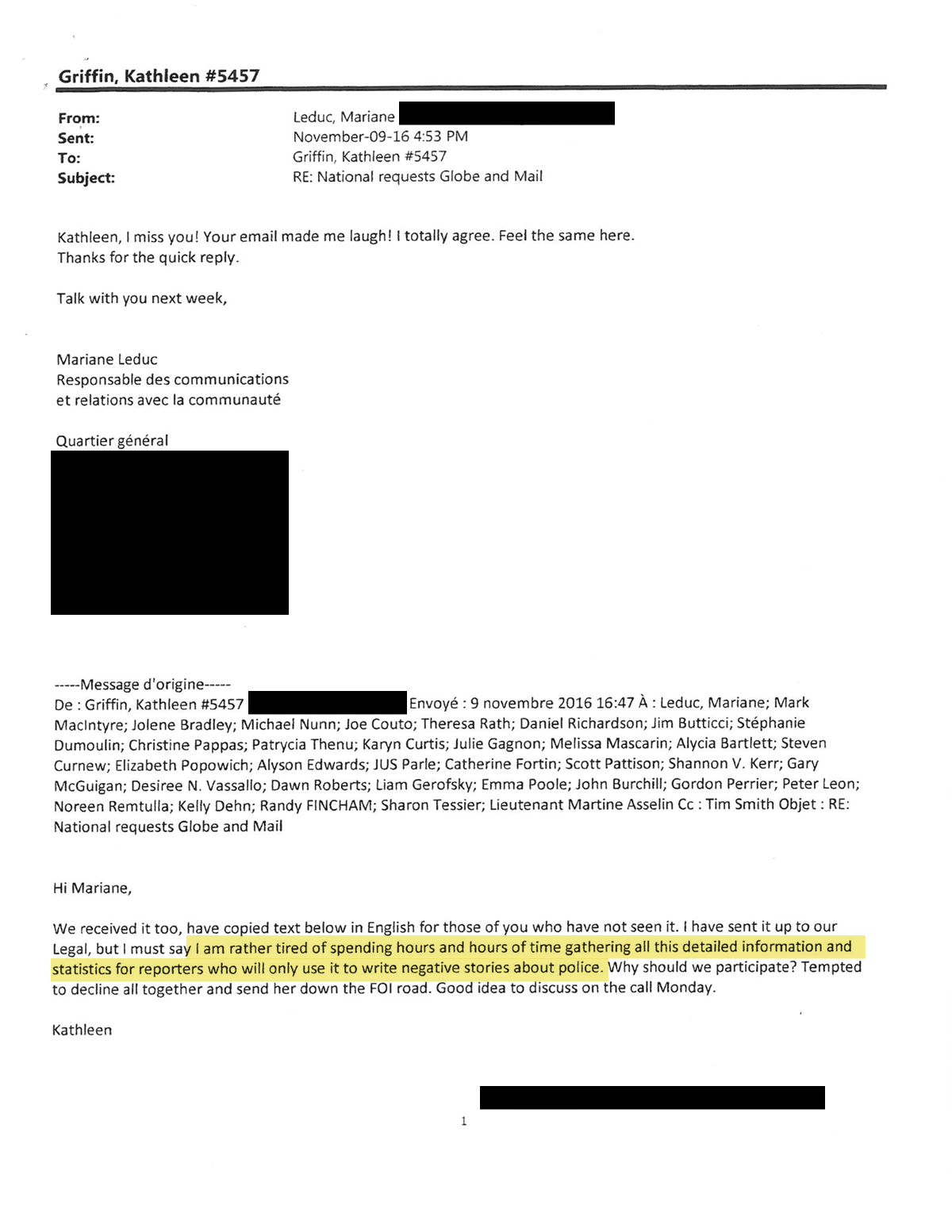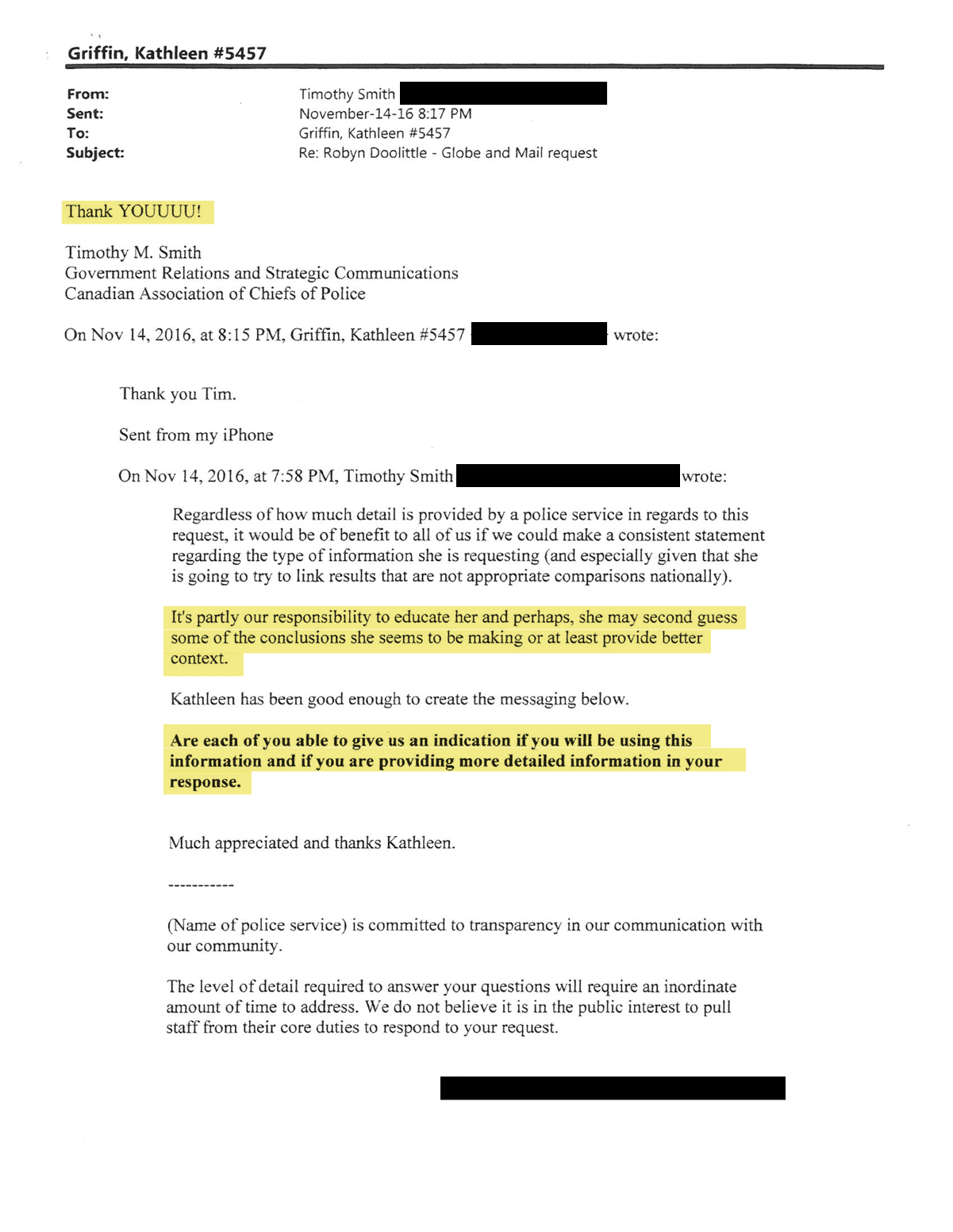 On Nov. 9, Ms. Leduc of Gatineau e-mailed the national network to say that “a few months ago, we all exchanged e-mails regarding the Globe and Mail [which was] requesting lots of statistics from every police service in Canada.” The communications director wanted to give everyone a heads-up that her service had received the 15 questions and that others might also get them.