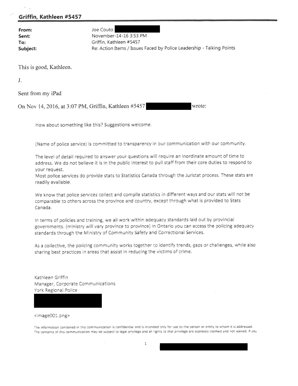 Email from Kathleen Griffin, the director of communications with the York Regional Police Service