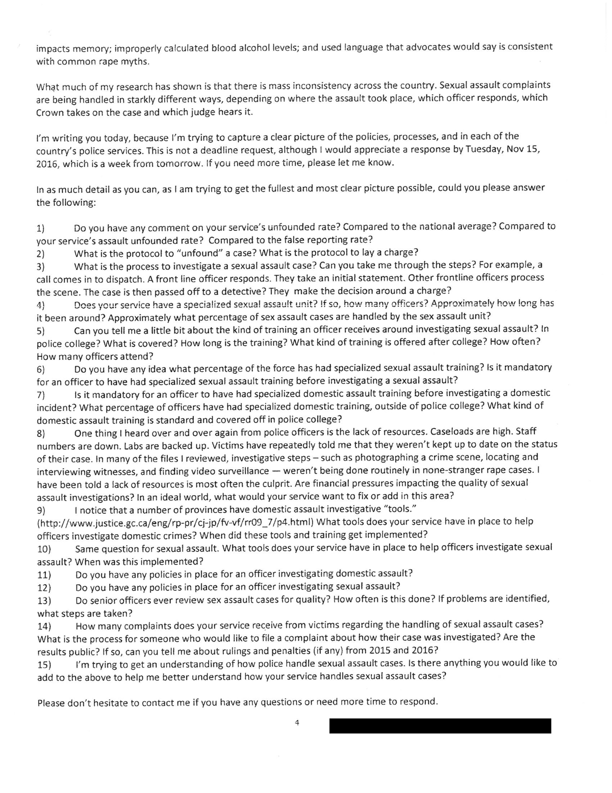 find your police jurisdictionAmong the questions asked: Does your service have a sex-assault unit? Is it mandatory for an officer to have specialized sexual-assault training before handling such crimes? And do senior officers ever review sex-assault cases to determine whether the investigation was thorough? Each service was also given a chance to comment on its unfounded rate.