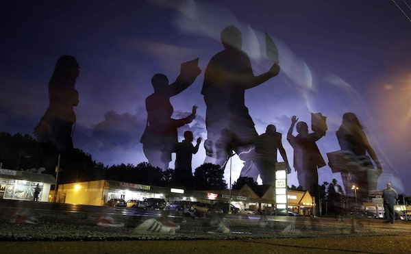 Protesters march in the street as lightning flashes in the distance in Ferguson, Mo. on Wednesday, Aug. 20, 2014. On Aug. 9, 2014, a white police officer fatally shot Michael Brown, an unarmed black 18-year old, in the St. Louis suburb.Jeff Roberson/The Associated Press