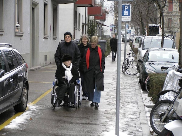 Lee Carter, red scarf, and her husband Hollis Johnson walk with her 89-year-old mother Kathleen "Kay" Carter, who suffered from spinal stenosis, in Switzerland . Her family took her there in January 2010 to end her life.
