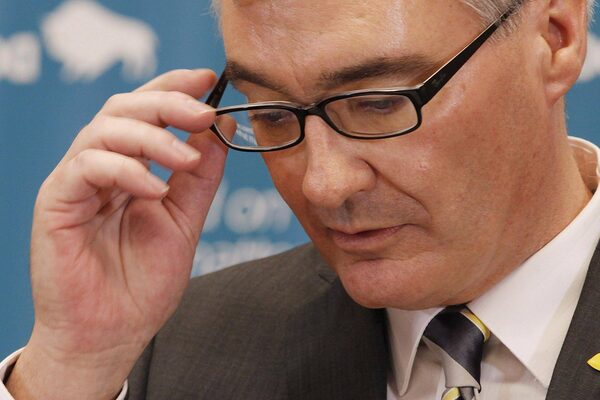 Stan Struthers pauses during a press news conference at the provincial legislature in Winnipeg on April 16, 2013.JOHN WOODS/The Canadian Press