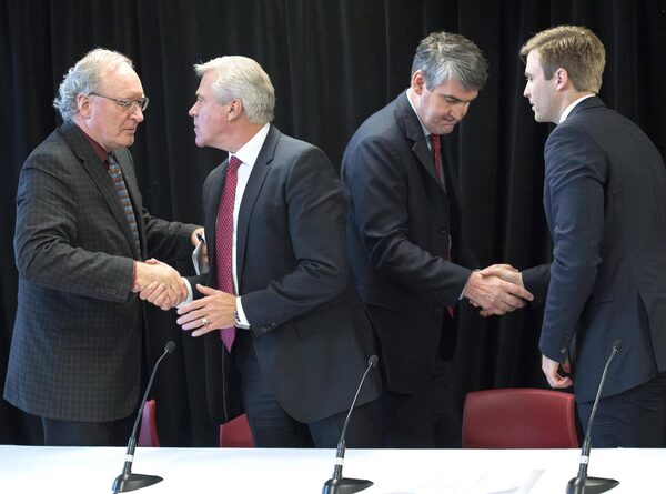 From left, Wade MacLauchlan, Dwight Ball, Stephen McNeil and Brian Gallant shake hands after a news conference in Annapolis Royal, N.S. on May 16, 2016. TAndrew Vaughan/The Canadian Press