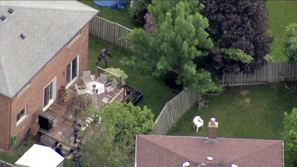 A York Regional Police officer takes aim at a black bear in a Newmarket, Ont., backyard on Monday, June 1, 2015. Police said they had no choice but to shoot the bear.