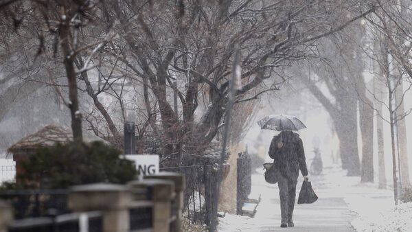 A man walks down the street during snow fall in Toronto, Wednesday, March 12, 2014.