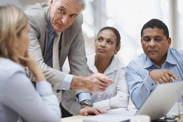Senior business man discussing project on laptop with staff.Jacob Wackerhausen