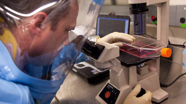 Employees of the National Microbiology Laboratory working with cell and virus cultures in Canada's only Containment Level 4 laboratory in Winnipeg.
