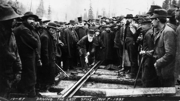 Donald A. Smith, later Lord Strathcona, drives home iron spike at Craigellachie, B.C. at 9:22 a.m. on Nov. 7, 1885, completing the CPR transcontinental line. With him are Sandford Fleming (left, top hat and white beard) and W.C. Van Horne (hand in pocket, black beard).The Canadian Press