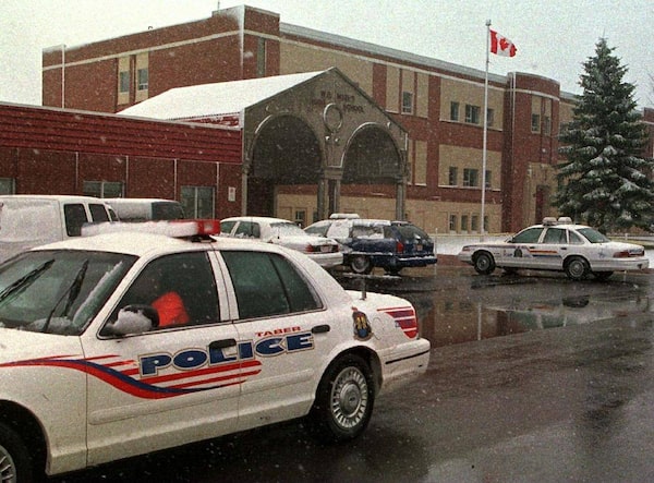 Taber police leave the scene of a W.R Myers High School where one high school student was shot to death and another seriously wounded after a boy described as unpopular opened fire at the high school in Taber, Alberta, April 28, 1999.Patrick Price/Reuters
