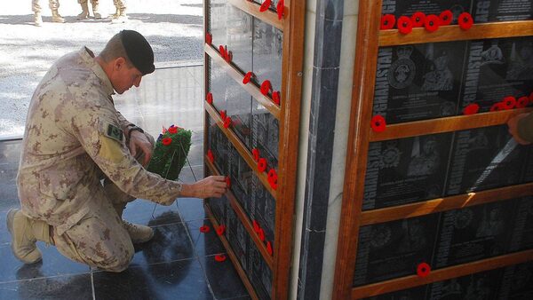 Canadian soldier places poppy on monument at Kandahar Airfield to Canadian soldiers killed in Afghanistan during a Remembrance Day ceremony, Thursday Nov. 11, 2010. The cenotaph which has stood in the dust of Kandahar to honour Canadians killed in Afghanistan will soon be coming home. THE CANADIAN PRESS/ Jonathan MontpetitJonathan Montpetit/THE CANADIAN PRESS/The Canadian Press