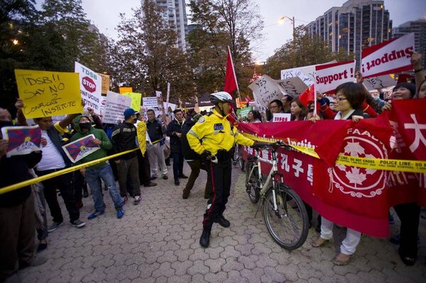 Protesters for and against the Confucius Institute gather outside the Toronto District School Board headquarters in Toronto, Ontario, Wednesday, October 1, 2014. Hundreds of protesters on both sides had to be separated by police as they shouted and carried signs.Kevin Van Paassen/The Globe and Mail