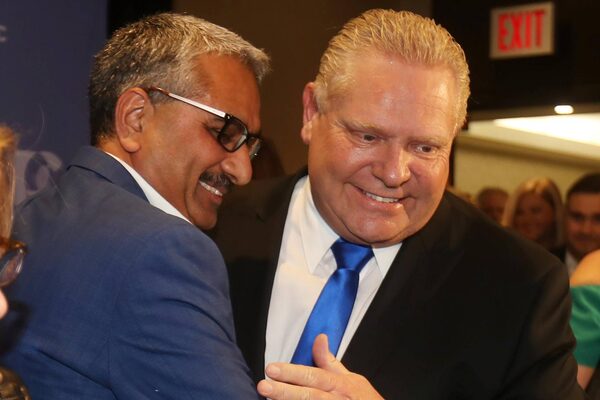Doug Ford and Jag Badwal, head of the provincial Progressive Conservatives, react in Markham, on March 10, 2018.Fred Thornhill