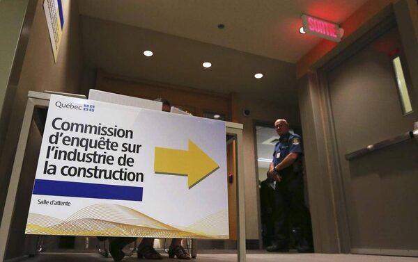 A sign points to the Charbonneau commission, a public inquiry into corruption within Quebec's construction industry, in Montreal September 17, 2012.CHRISTINNE MUSCHI/Reuters