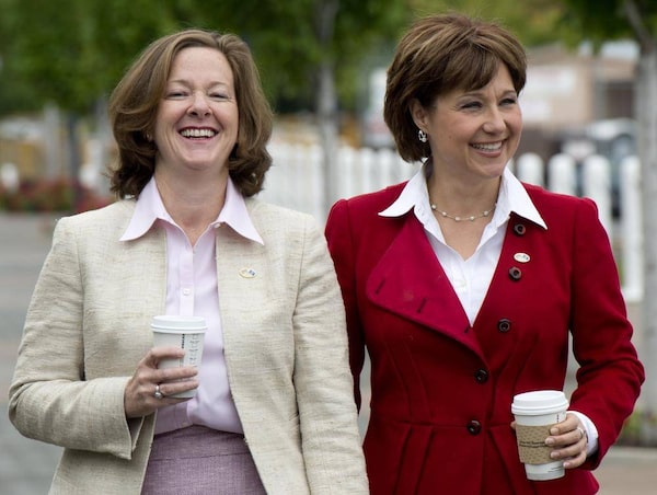 British Columbia Premier Christy Clark, right, and Alberta Premier Alison Redford are seen prior to a closed door meeting in Kelowna, B.C. Friday, June 14, 2013.Jonathan Hayward/The Canadian Press