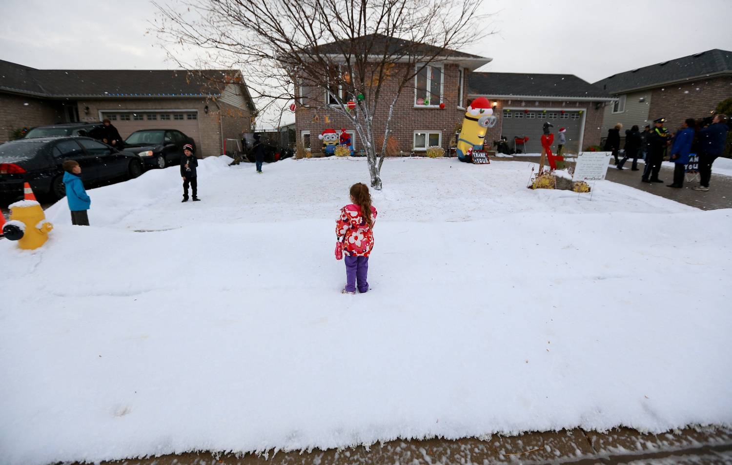 Kids play as artificial snow covers the lawn in front of Evan Leversage, 7, home in St. George, Ontario. The community put their decorations up early and held a Christmas parade for Evan who isn't expected to live until Christmas.Glenn Lowson/The Globe and Mail