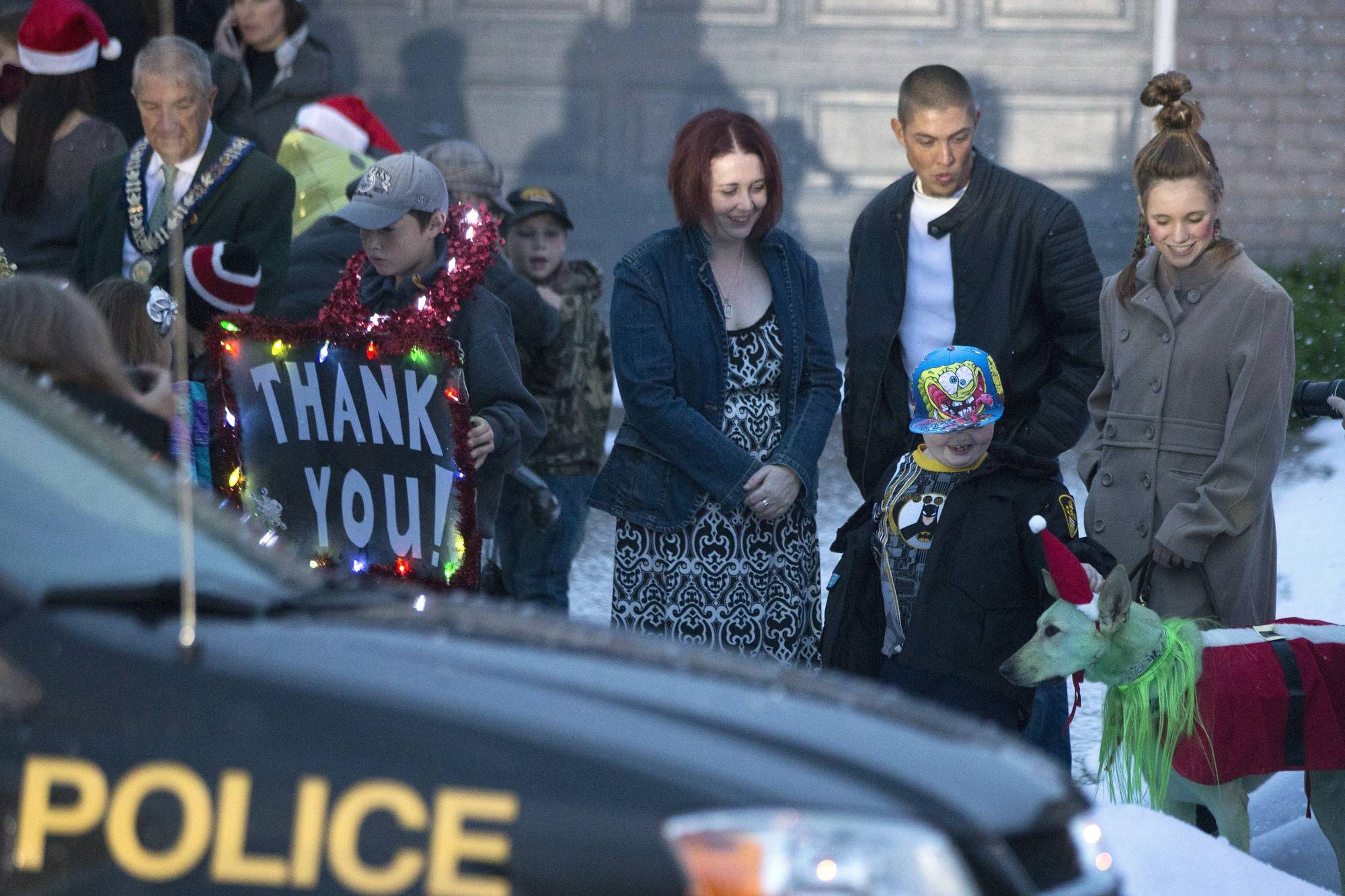 Evan Leversage pats a dog outside his family home as he stands with his with mother Nicole Wellwood (centre) and father Travis Leversage (centre right) before going to a ride in a police car ahead of watching a Christmas Parade.Chris Young/The Canadian Press