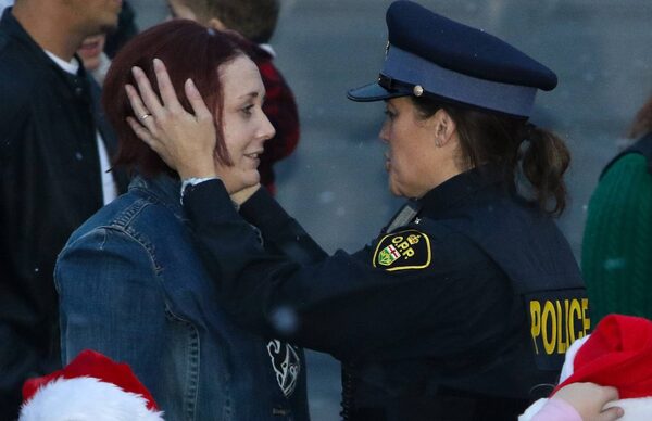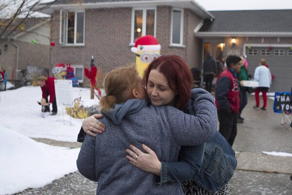 Evan Leversage's mom Nicole Wellwood gets a hug from an OPP officer, on her son Evan's special Christmas celebration night in St.George, Ontario.Glenn Lowson/The Globe and Mail
