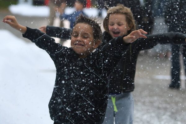 Kids play as artificial snow covers the lawn in front of Evan Leversage’s home.Glenn Lowson/The Globe and Mail