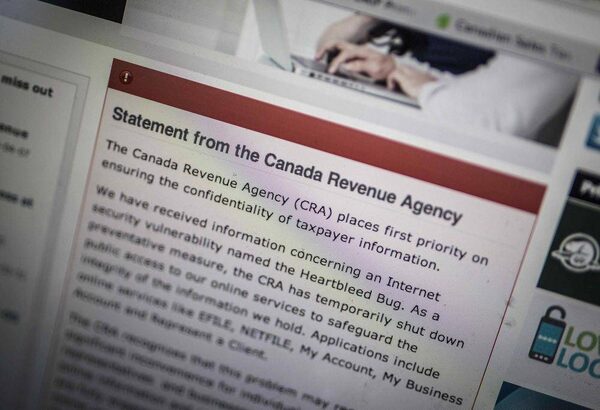 The Canada Revenue Agency website is seen on a computer screen displaying information about an internet security vulnerability called the "Heartbleed Bug" in Toronto, April 9, 2014.MARK BLINCH/Reuters