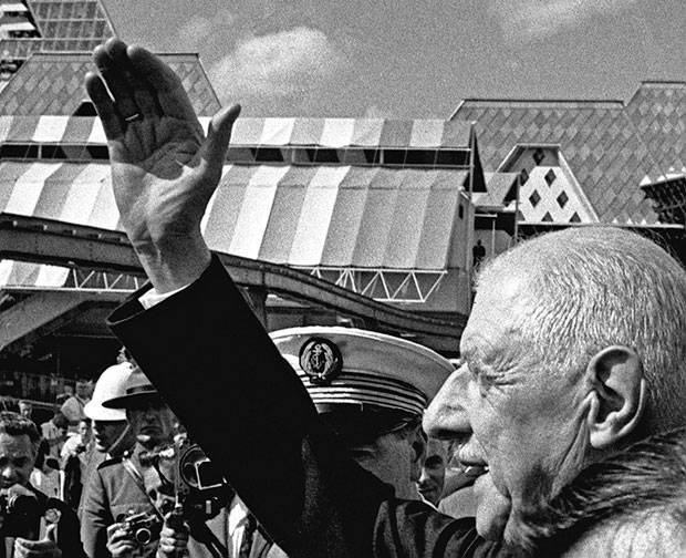 July 24, 1967: Gen. de Gaulle salutes the Montreal crowd during his famous speech.