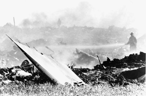 Firefighters spray smouldering remains of an Air Canada DC-8 at Pearson International Airport in Toronto in this July 5, 1970 file photo. The plane, en route from Montreal to Los Angeles, went down north of the airport, killing all 109 people aboard.Duncan Woods/The Canadian Press