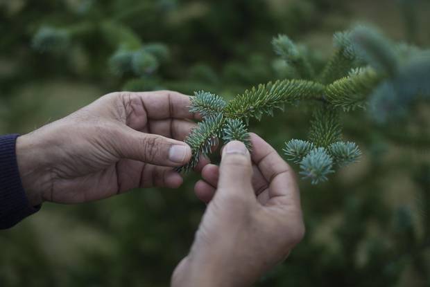 Dr. Raj Lada assesses the needles on a tree in a research orchard in Truro, N.S. on Dec. 8, 2017.