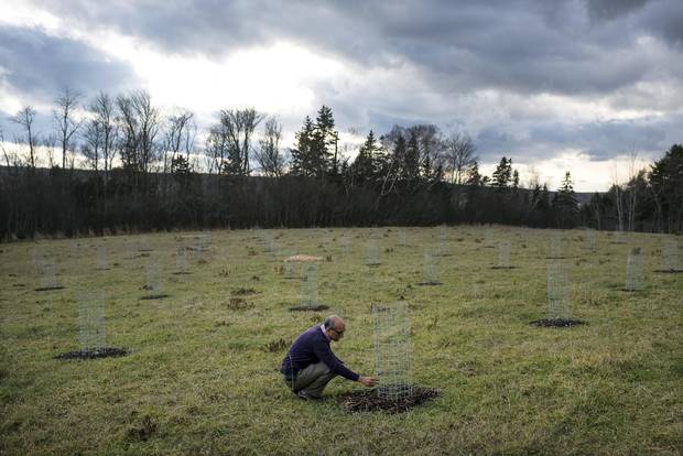 Dr. Raj Lada checks on saplings protected with wire mesh in a research orchard in Truro, N.S. on Dec. 8, 2017.