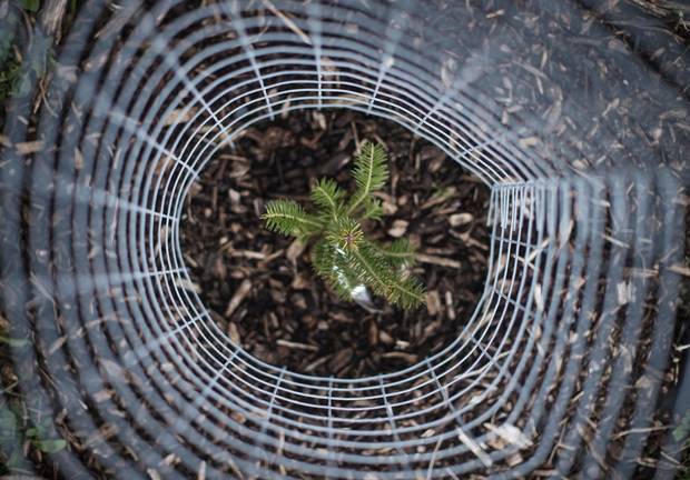 A sapling protected in wire mesh is seen in a Christmas Tree Research Centre orchard in Truro, N.S. on Dec. 8, 2017.