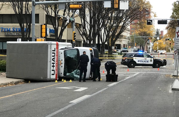 Edmonton Police investigate at the scene where a man hit pedestrians then flipped the U-Haul truck he was driving, pictured at the intersection at 107 Street and 100th Avenue in front of the Matrix Hotel in Edmonton, Alberta, October 1, 2017.Candace Elliot/Reuters