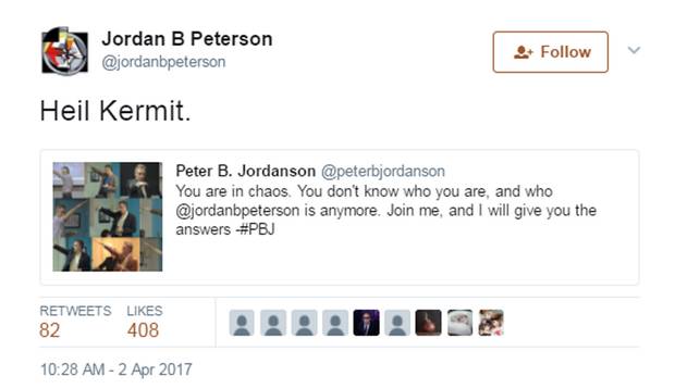 In a few tweets and other scattered images, Prof. Peterson has also taken up Kermit the Frog, a mainstay in anti-Pepe memes used to speak out against the extreme right.