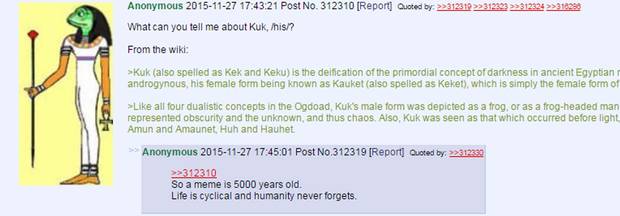 Kek is the name given to a virtual deity created by the online world, and specifically by the 4chan discussion board, populated by a mix of far-right Internet users, libertarians, trolls and teenage pranksters. Originally a garbled version of "LOL" (laugh out loud) from online gaming and Internet forums, "Kek" is also a variation on "Kuk," an ancient Egyptian god symbolizing primordial darkness and chaos, and usually depicted with the head of a frog. In recent years, some adherents to the "church of Kek" have built a semi-ironic "cult of Kek" around the god to signal their identity as agents of disorder.