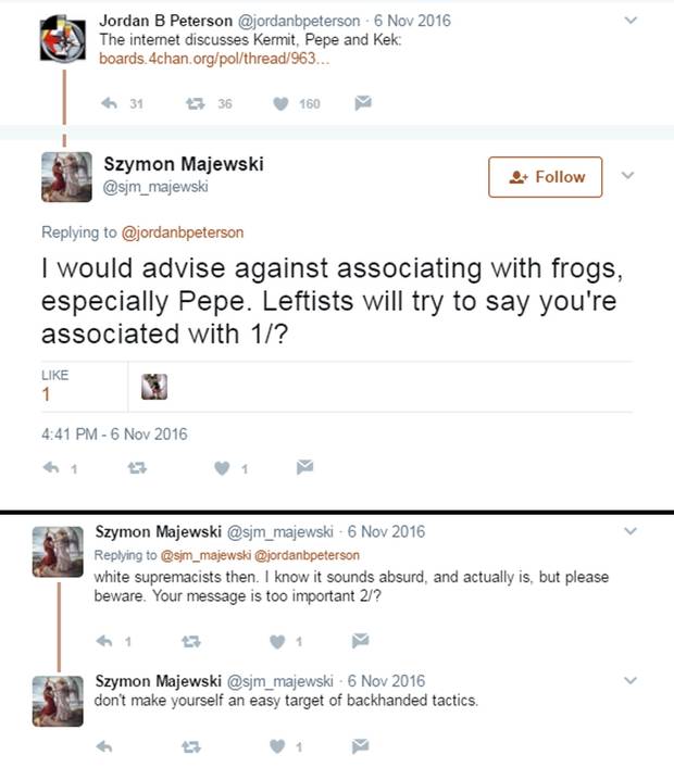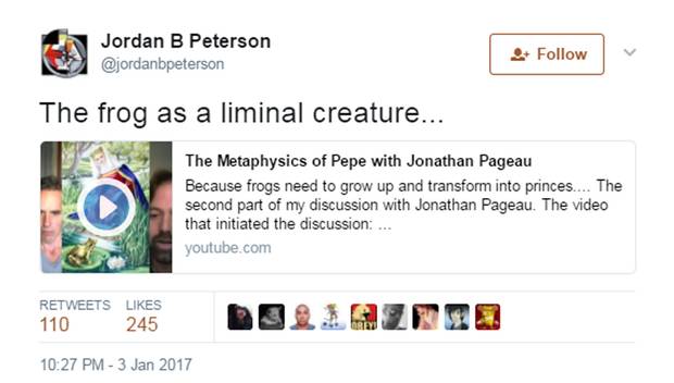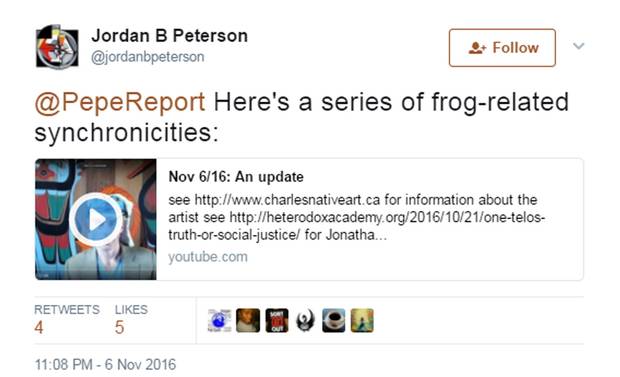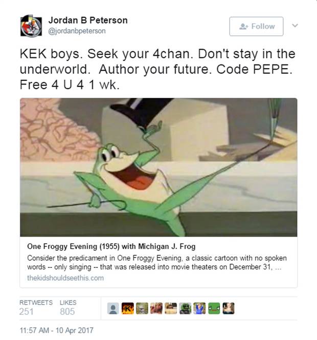 Prof. Peterson says he is fascinated by some aspects of this world, which is why he tweets out links to discussions about him and Kek and meme variations on the satirical frog, Pepe. He points out that such links form only a small part of his total output of several thousand tweets.