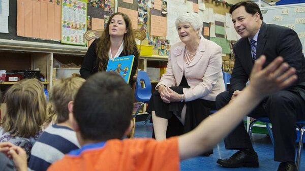 Ontario Minister of Education Liz Sandals (centre) and Minister of Training, Colleges and Universities Brad Duguid (right) visit a full-day kindergarten class in Toronto before announcing that the government will be doubling the time students spend in teacher's college and reducing teacher's college admissions in the province by 50 percent.Della Rollins for the Globe and Mail