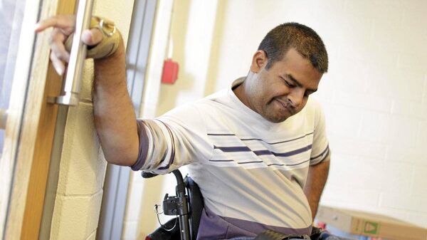 Harmandeep Saini, 25, works on opening and going through doors with his Physio/Occupational Therapy Assistant Heather Densmore.Peter Power/The Globe and Mail