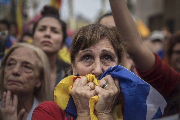 Oct. 27, 2017: People react as they watch the parliament session on a huge screen during a rally outside the Catalan parliament.SANTI PALACIOS/The Associated Press