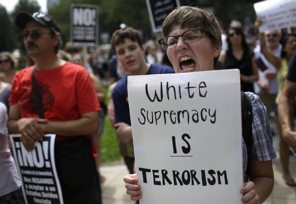 People demonstrate against hate, white supremacy groups and U.S. President Donald Trump in Chicago on Aug. 13, 2017.Joshua Lott/AFP / Getty Images