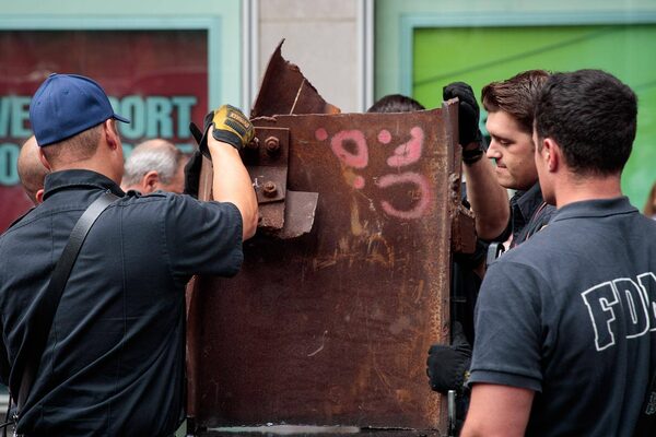 Firefighters from FDNY Engine 54, Ladder 4, Battalion 9 prepare to move a piece of steel from the World Trade Center to a trailer, during a ceremony outside the Fox News studios to mark the beginning of the piece of steel's journey from New York City to Gander, Newfoundland in Canada, September 6, 2016 in New York City. Following the 9/11 attacks, 40 planes were grounded in the small town of Gander. In the following days, residents of Gander helped care for the nearly 6,000 people who were stranded.Drew Angerer/Getty Images