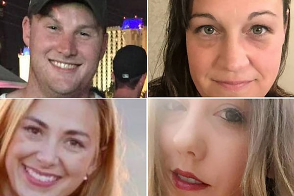 Four Canadian victims of the mass shooting in Las Vegas have been identified. Clockwise from top left: Jordan McIldoon, of Maple Ridge, B.C., Jessica Klymchuk of Valleyview, Alta., Calla Medig, of Jasper, Alta. and Tara Roe of Okotoks, Alta.
