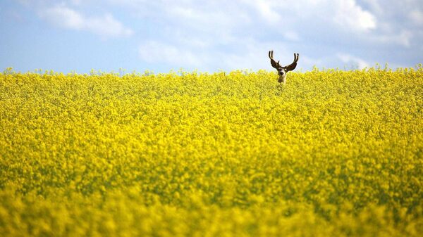 A stag stands in a neck high field of canola north of Cremona, Alta., on July 31, 2011.