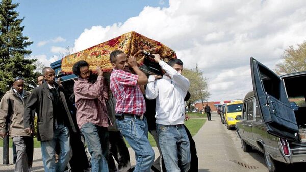 Pallbearers carry the casket of Abdinasir Dirie, 19, in Edmonton on Monday, April 26.
